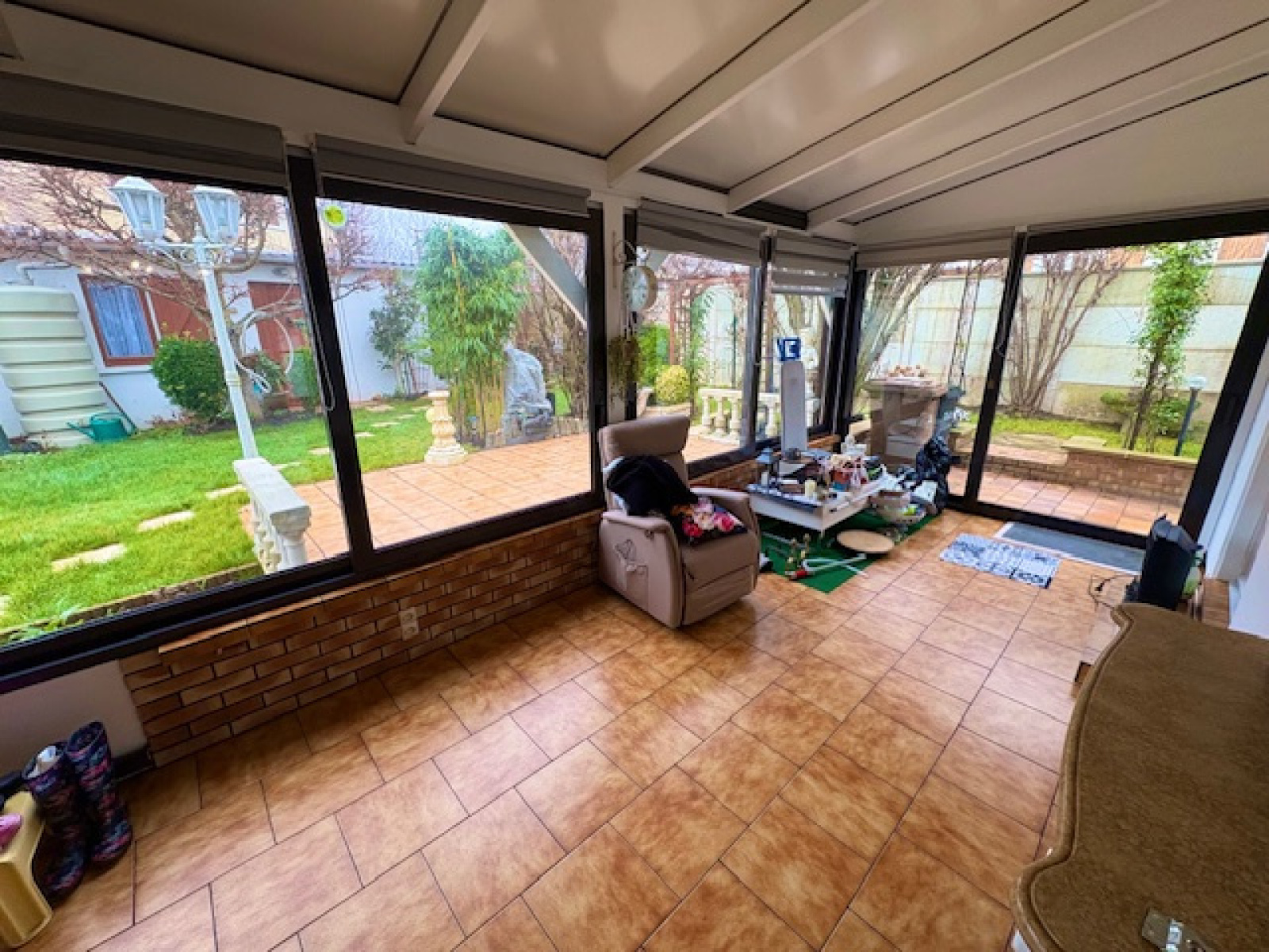 Une véranda donnant sur 350m² de terrain clos de mur avec des dépendances.